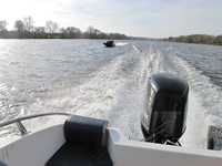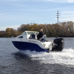 Тест варианта с реверсредуктором и гребным винтом на реке Москва. Во время теста был установлен винт 13,25х17" Максимальная скорость катера "Новая Ладога М" с водителем и 40л топлива составила 59,8 км/час при 5060 об/мин.